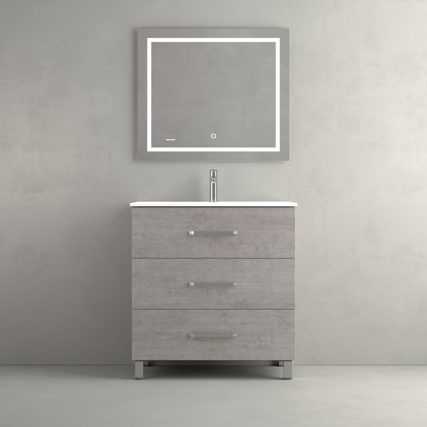 Mueble de baño con base y frontal en melamina de 19 mm. 3 cajones Hettich con cierre silencioso y extensión total, tiradores de níquel satinado. Cajón inferior con barandilla.