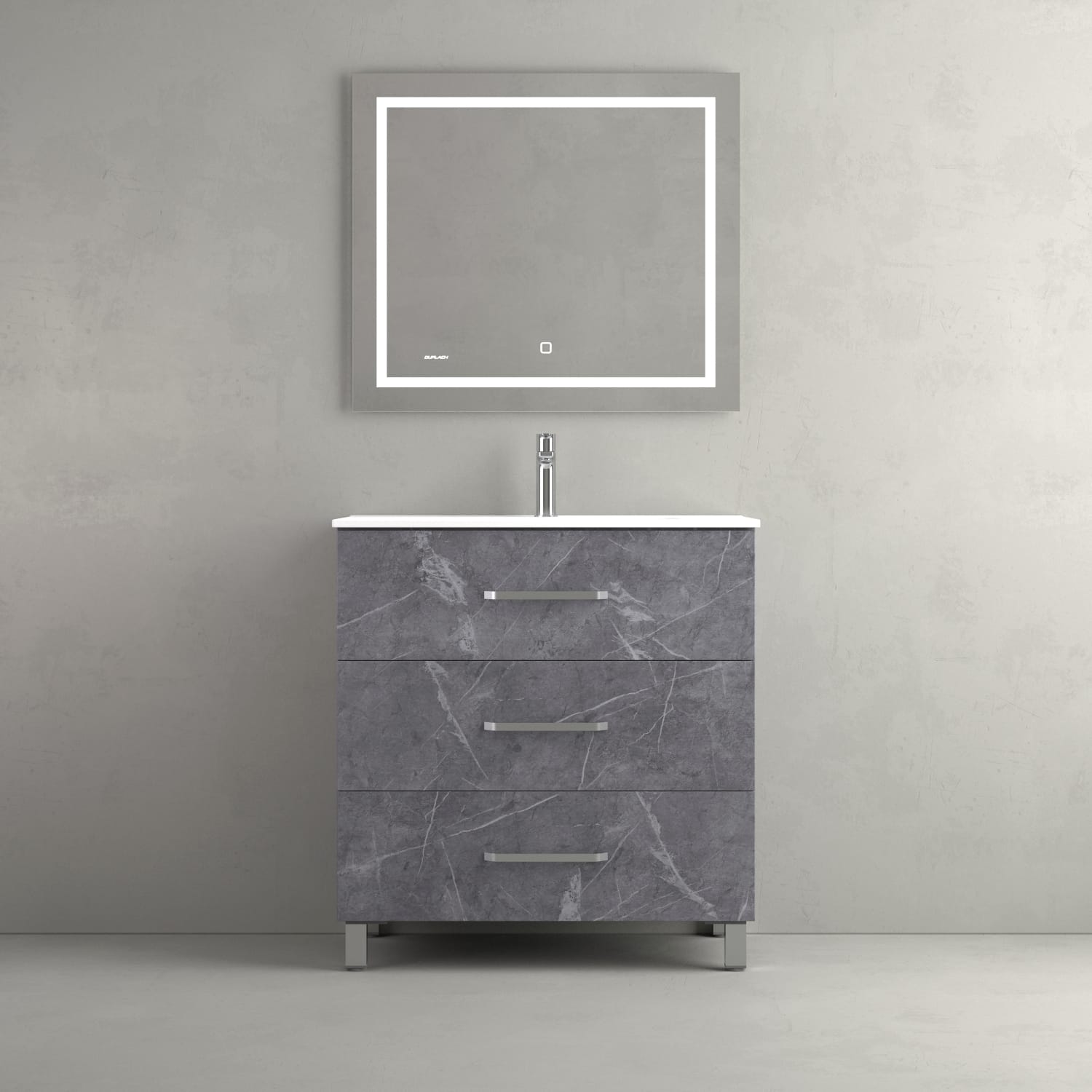 Mueble de baño con base y frontal en melamina de 19 mm. 3 cajones Hettich con cierre silencioso y extensión total, tiradores de níquel satinado. Cajón inferior con barandilla.