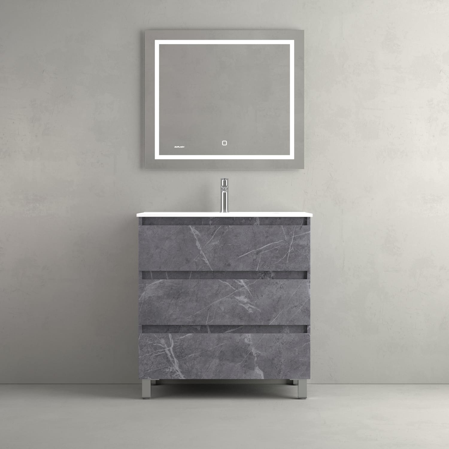 Mueble de baño con base y frontal en melamina de 19 mm. 3 cajones Hettich con cierre silencioso y extensión total, tiradores de níquel satinado. Cajón inferior con barandilla.