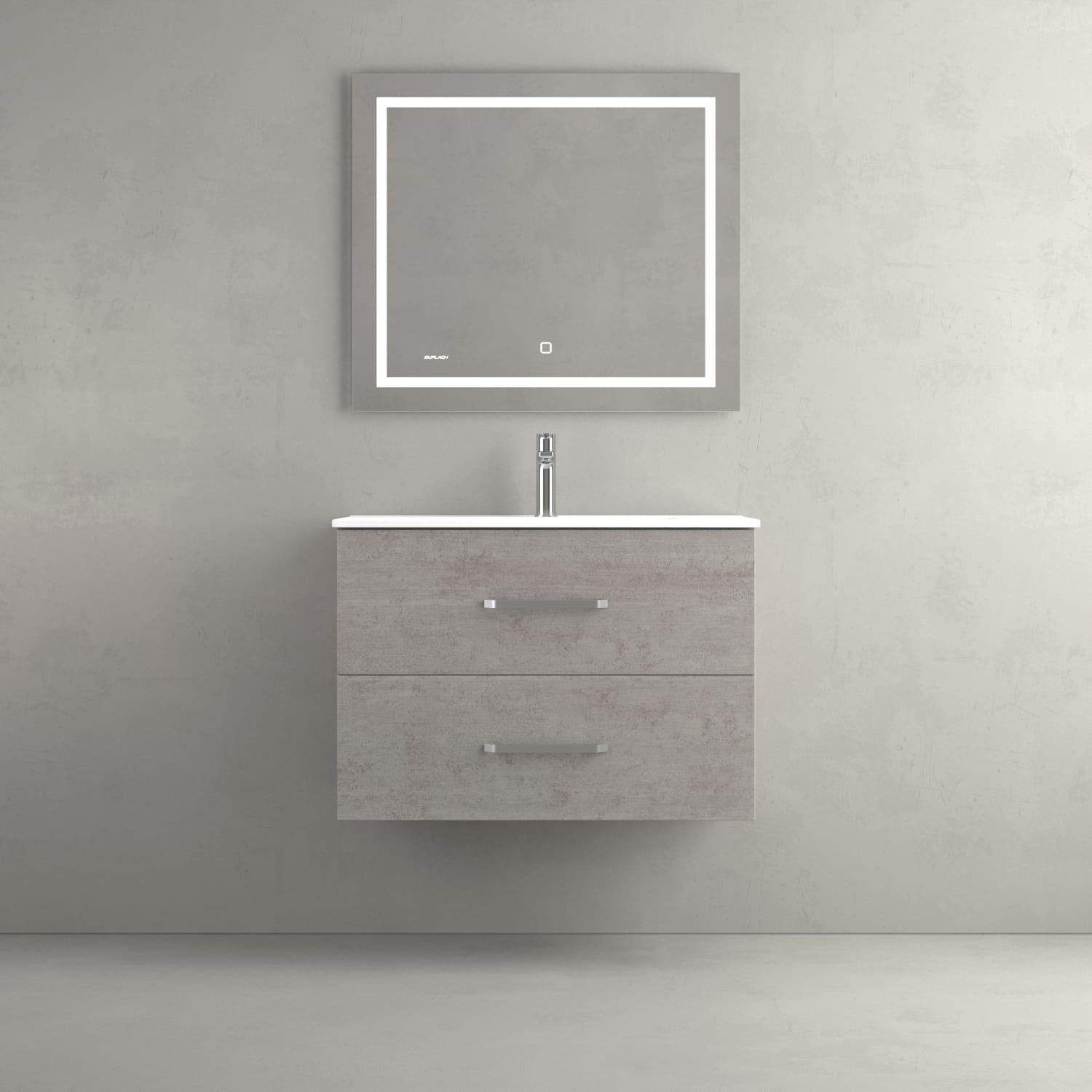 Mueble de baño con base y frente en melamina de 19 mm. 2 cajones Hettich con cierre silencioso y extracción total, tiradores ocultos. Cajón inferior con barandilla.