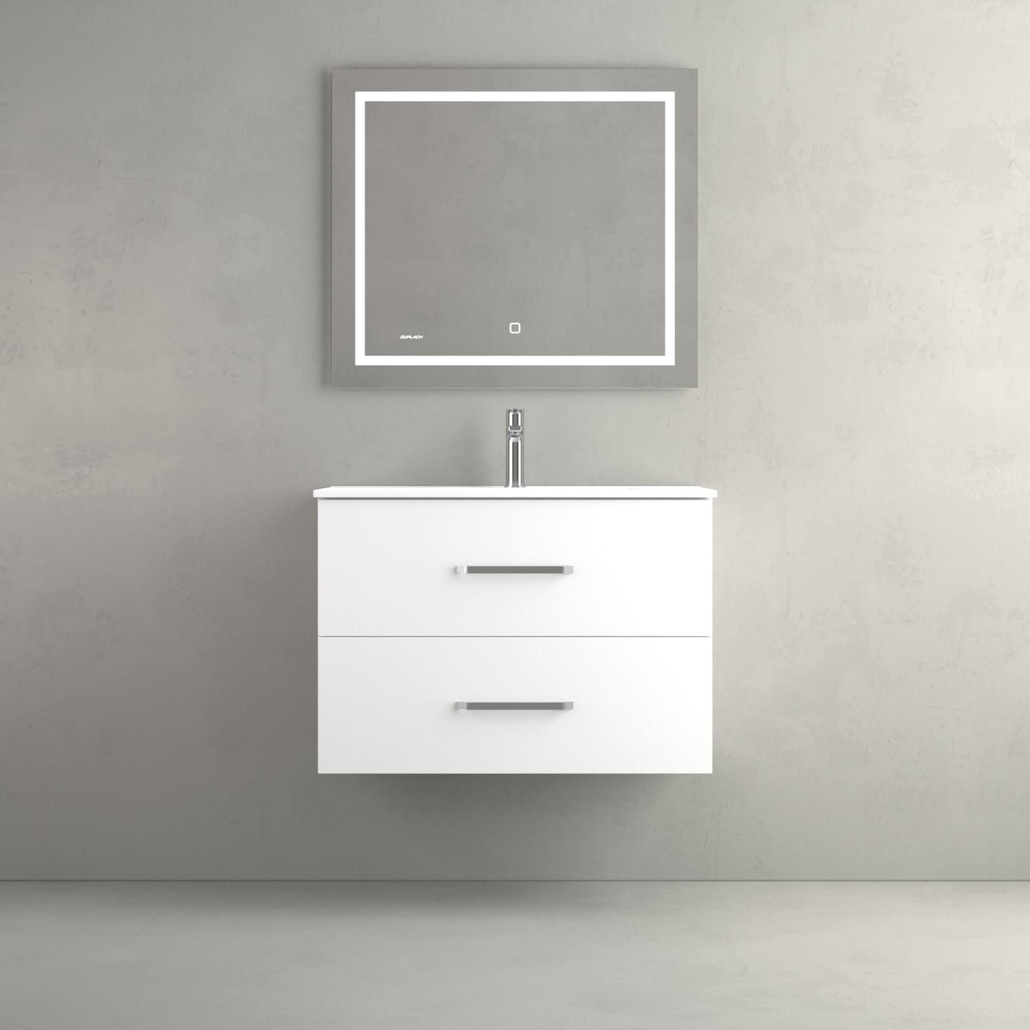 Mueble de baño con base y frente en melamina de 19 mm. 2 cajones Hettich con cierre silencioso y extracción total, tiradores ocultos. Cajón inferior con barandilla.