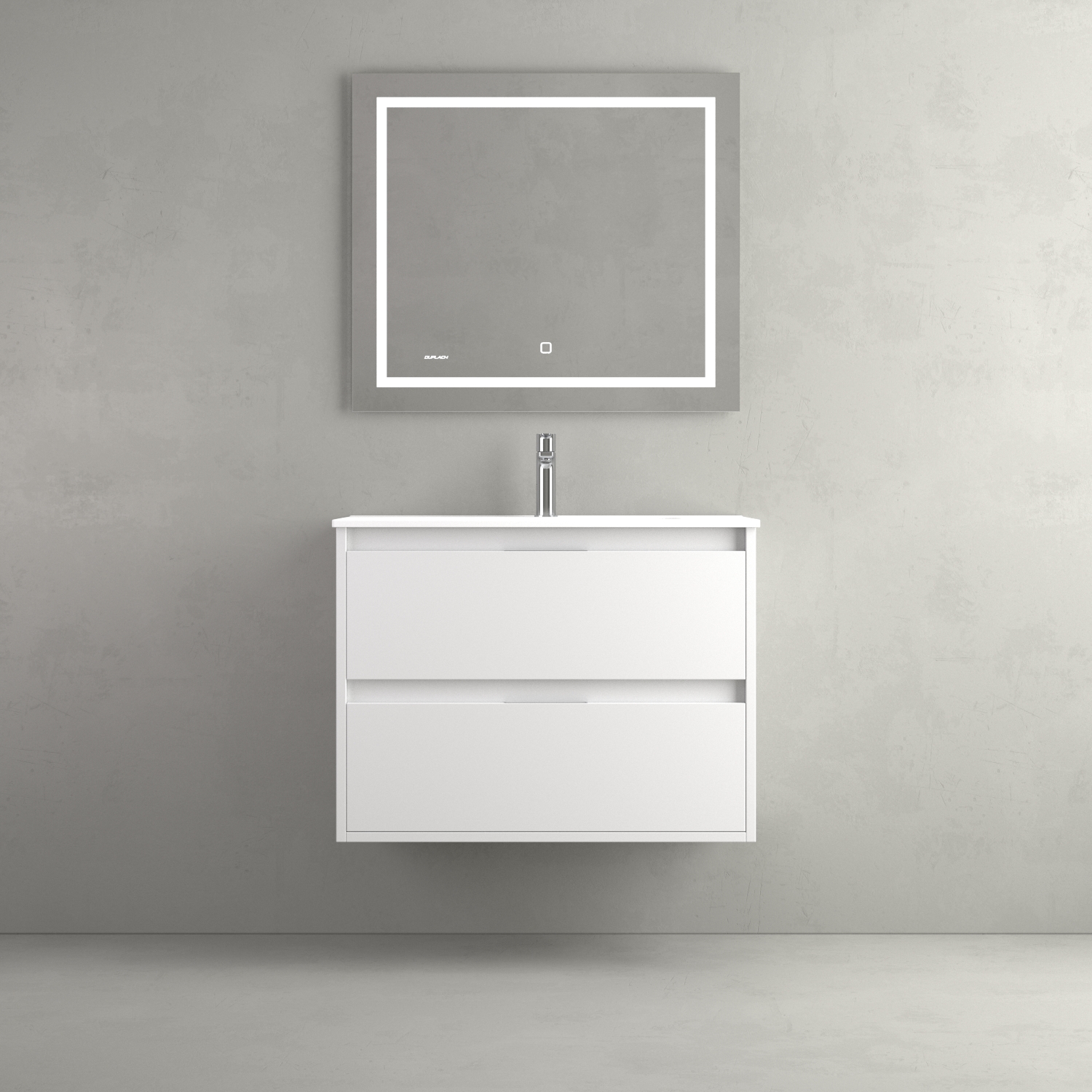 Mueble de baño con base y frente en melamina de 19 mm. 2 cajones Hettich con cierre silencioso y extracción total, tiradores ocultos. Cajón inferior con barandilla.