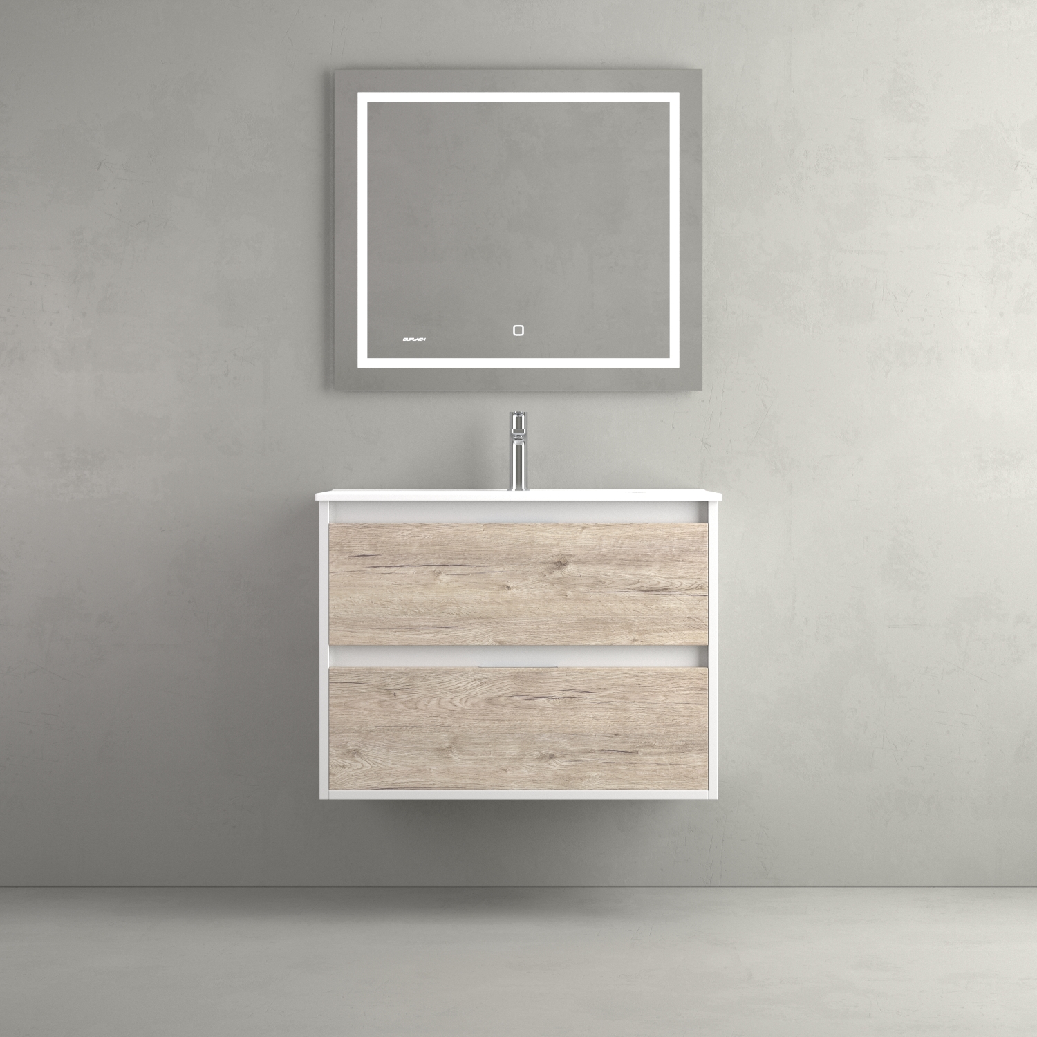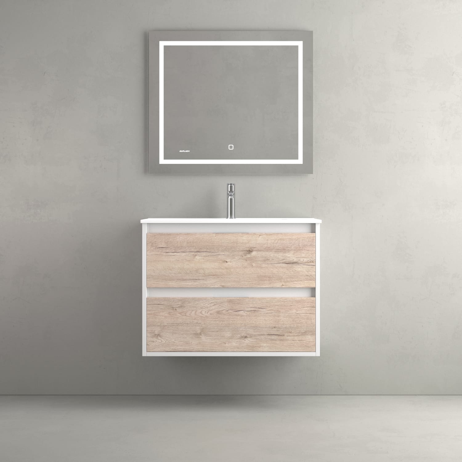 Mueble de baño con base y frente en melamina de 19 mm. 2 cajones Hettich con cierre silencioso y extracción total, tiradores ocultos. Cajón inferior con barandilla.